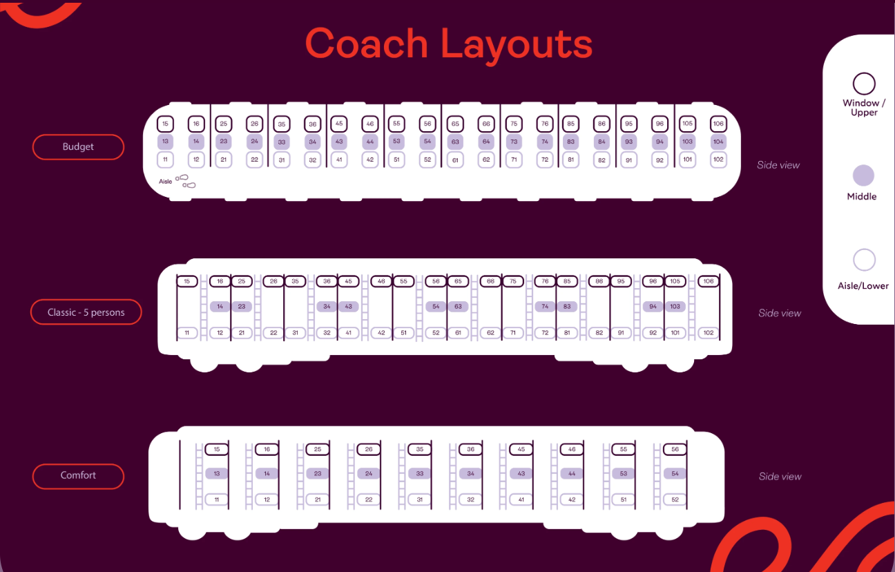 | Classic | 5-person compartment, 5-person compartment - women only, or private compartment |