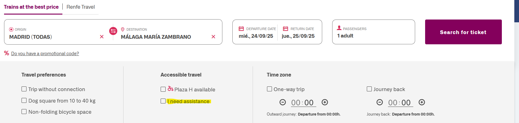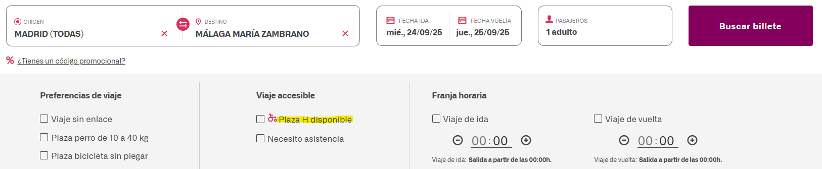 - Via the Renfe website, by ticking the box which states, Plaza H available (Plaza H disponible) after you have selected your preferred train.