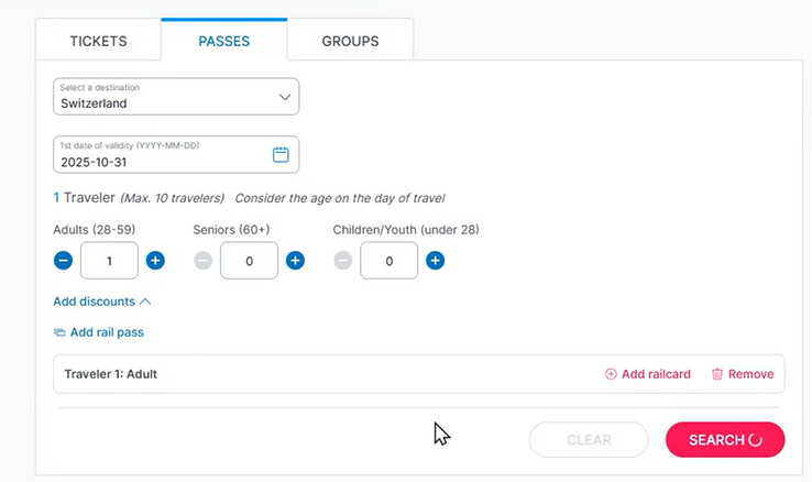- If travelling with a Swiss Travel Pass or a Swiss Half Fare Card, please select it before clicking on "search" button.