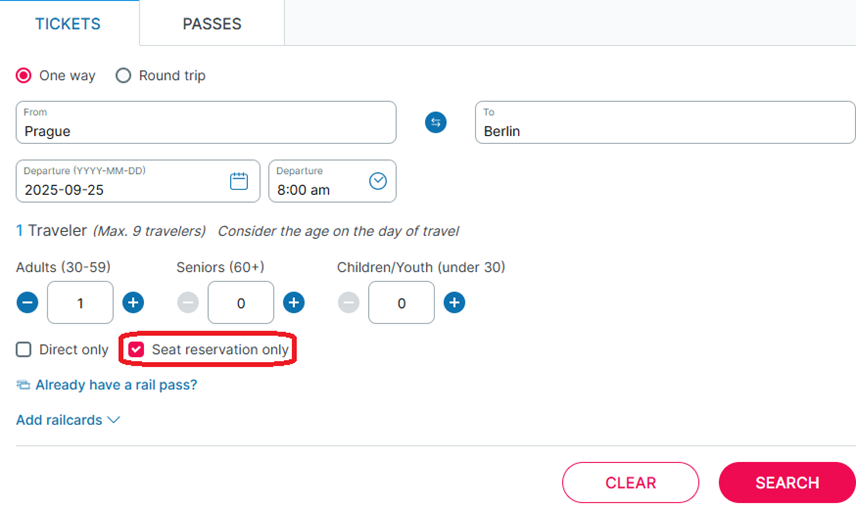 To reserve seats for DB and OBB enter the arrival and departure cities, the departure date and time, and the passengers types. Then click on "Seat reservation only" and search.