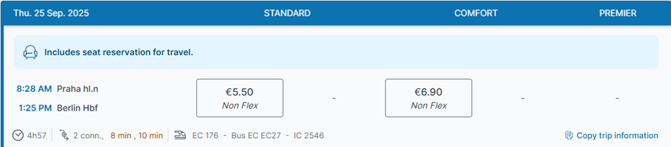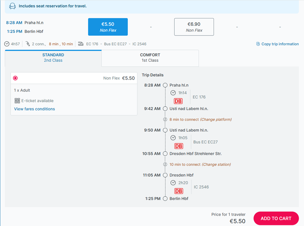 Select your fare and class for further details and fare conditions. Then add the ticket to your cart.