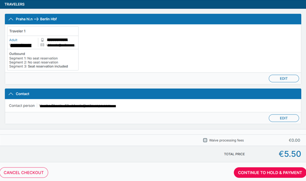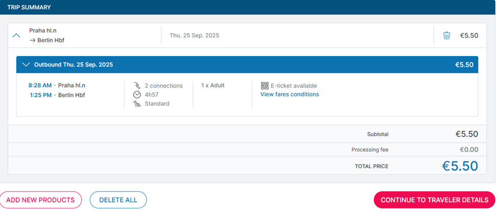 You'll find the Trip summary in your cart. Add or remove products if necessary. When you're ready and you've double checked the ticket information. Continue to traveler details.