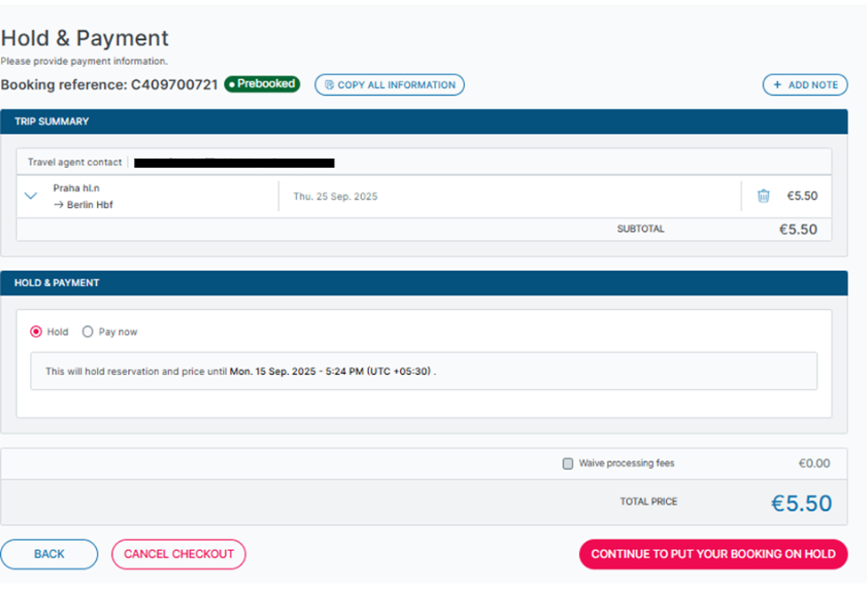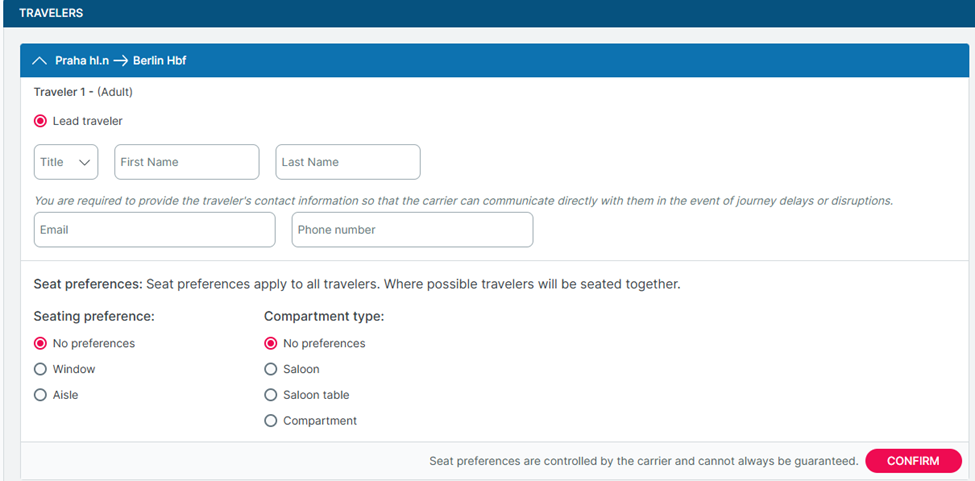 The booking is now created. Please enter the travelers’ information, review all the details carefully, and click on Confirm. You can also select your seat preferences at this stage."